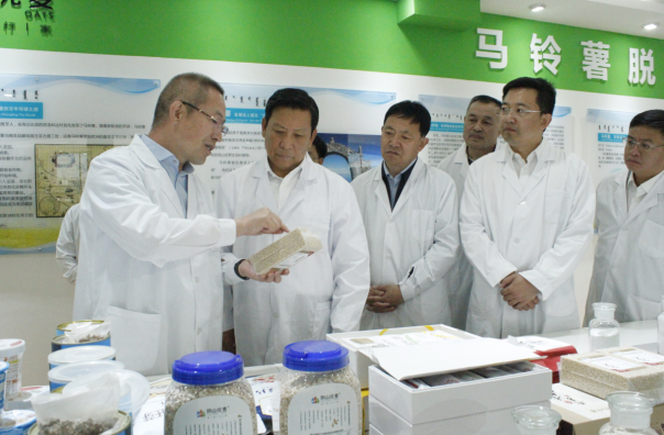 段志強一行首先參觀了民豐種業(yè)脫毒組培中心展廳,詳細了解了馬鈴薯脫毒種薯生產過程及企業(yè)發(fā)展情況。張國介紹,內蒙古民豐種業(yè)有限公司成立于2008年,注冊資本1.3億元,已累計完成投資10億元以上,公司已發(fā)展成為集馬鈴薯種薯、訂單薯生產及馬鈴薯、燕麥深加工于一體的全產業(yè)鏈集團化企業(yè),是“農業(yè)產業(yè)化國家重點龍頭企業(yè)”、“國家高新技術企業(yè)”、“自治區(qū)扶貧龍頭企業(yè)”。目前,公司已發(fā)展成為一家融合農業(yè)和食品加工業(yè)的全產業(yè)鏈集團化公司,形成以食品加工帶動農業(yè),以農業(yè)服務食品加工,一、二、三產融合、農商互聯齊頭并進的良性發(fā)展業(yè)務格局。