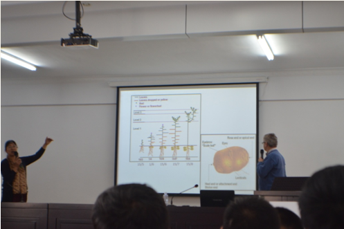 培訓(xùn)會上,Harrie先生對馬鈴薯規(guī)范化種植管理的重要意義進(jìn)行了深刻闡述,并就馬鈴薯各生長周期內(nèi)易發(fā)、頻發(fā)的病蟲害及其防治措施與馬鈴薯種植、生產(chǎn)全程現(xiàn)代化管理等內(nèi)容進(jìn)行了講解,理論聯(lián)系實(shí)際,內(nèi)容詳實(shí)全面,得到了參訓(xùn)學(xué)員的廣泛認(rèn)可。培訓(xùn)全程為英語授課,為了使參訓(xùn)學(xué)員能夠真正聽得懂、學(xué)得會,公司特聘內(nèi)蒙古農(nóng)業(yè)大學(xué)農(nóng)學(xué)專業(yè)教授進(jìn)行了全程翻譯。